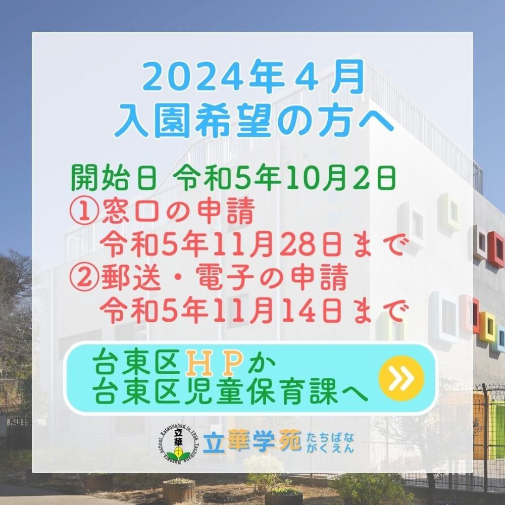 2024年4月入園の施設見学を開始いたしました。10・11月の予約が立華学苑ホームページから可能です。詳しくは立華学苑のホームページをご確認ください。#2024年度入園#台東区保育園#施設見学#保育園#台東区#谷中#台東区谷中#立華学苑#たちばながくえん#行事の多い園