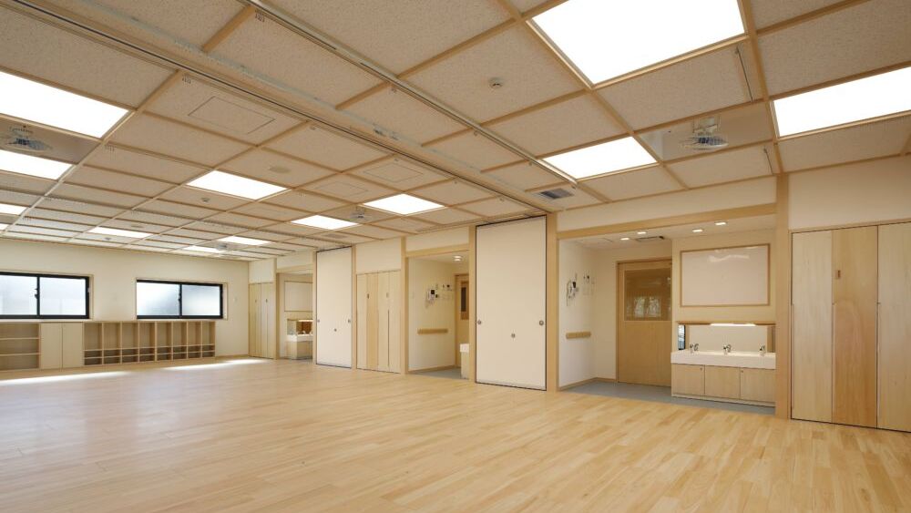 保育室の壁は可動式の為、行 事の時には、壁をはずしてホールとして使用したり、異年齢児保育として使用できます。