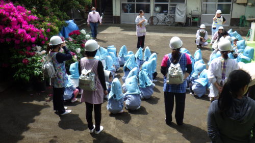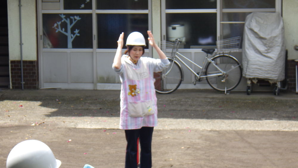 例年、泣いてしまう子が多いのですが、今年は誰も泣かずに、園児たちは、先生から「避難訓練」の説明をしっかり聞いていました。