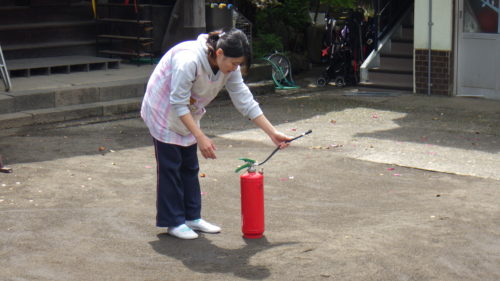 避難訓練の説明後、初期消火の模擬訓練を行い、避難訓練を終えました。